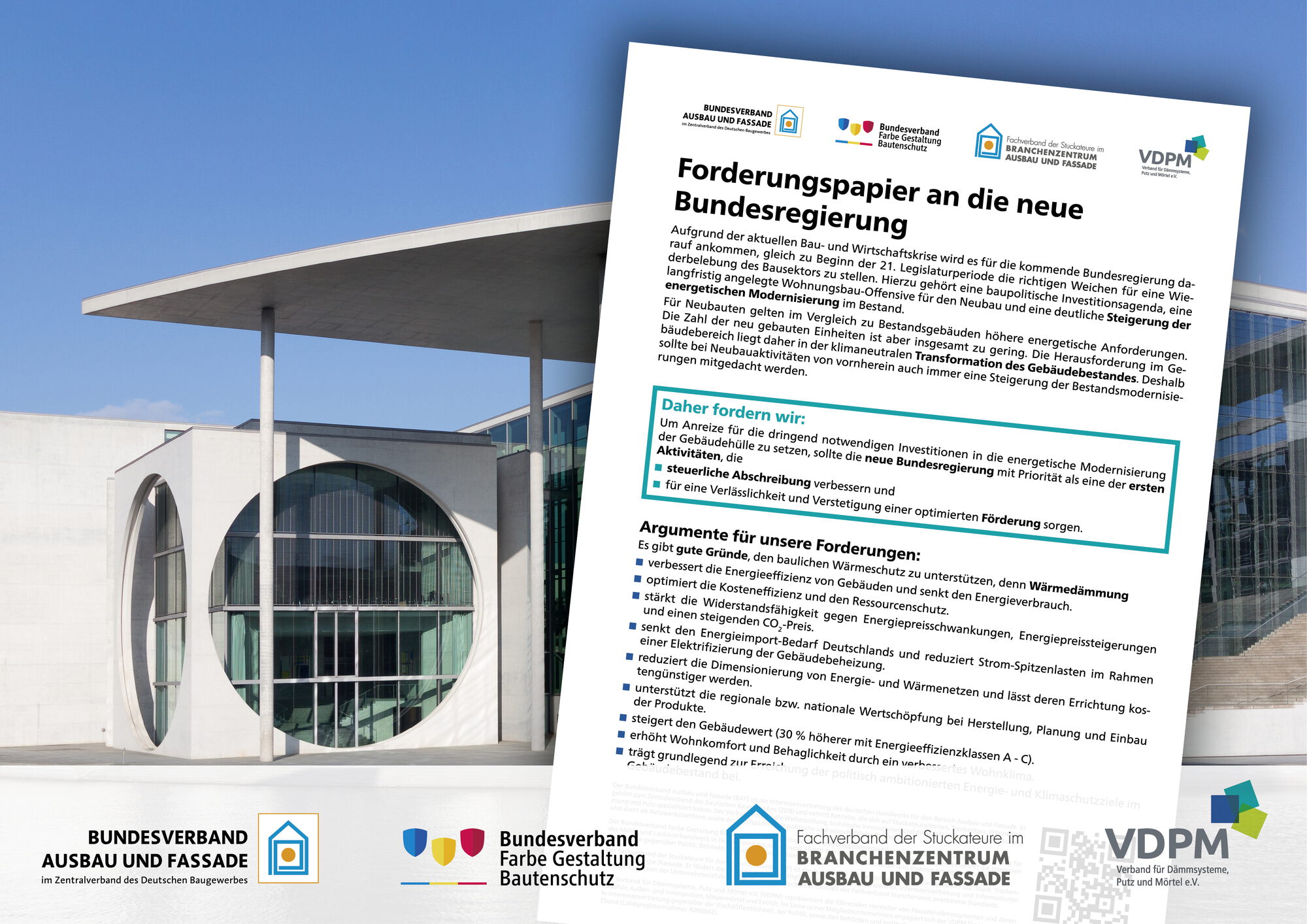 So steht es im aktuellen Forderungspapier, das der Verband für Dämmsysteme, Putz und Mörtel (VDPM) zusammen mit dem Bundesverband Ausbau und Fassade, dem Bundesverband Farbe Gestaltung Bautenschutz und dem Fachverband der Stuckateure für Ausbau und Fassade Baden-Württemberg an die Politik gerichtet hat.