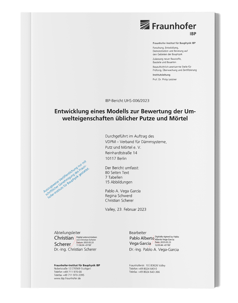 Basierend auf den Ergebnissen zeichnet sich ab, dass nicht mit Überschreitungen von Grenzwerten am Ort der Beurteilung zu rechnen ist. Hier können Sie den Forschungsbericht “Entwicklung eines Modells zur Bewertung der Umwelteigenschaften üblicher Putze und Mörtel” herunter laden.