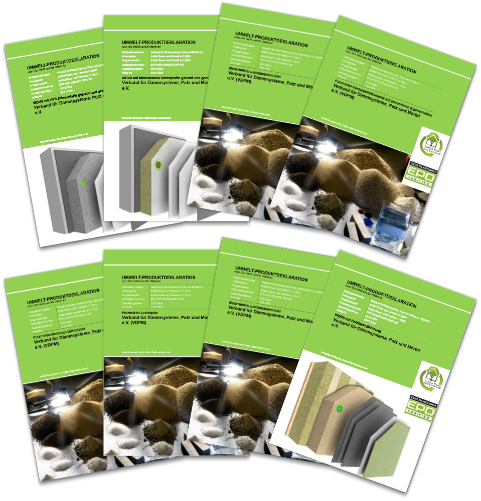 Verantwortungsvolle Hersteller legen interessierten Bauherren und Architekten ihre Umwelt-Produktdeklarationen offen. In der Regel ist dies auch online möglich. Die Umwelt-Produktdeklarationen können auf den Internetseiten der Hersteller oder können beim Institut Bauen und Umwelt e.V. abgerufen werden. Die VDPM-Muster Umwelt-Produktdeklarationen finden Sie auch auf unserer Website. Die VdL-Muster Umweltproduktdeklarationen für Pastöse Putze finden Sie auf der Website des VdL.
