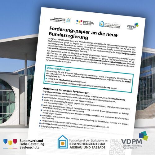 So steht es im aktuellen Forderungspapier, das der Verband für Dämmsysteme, Putz und Mörtel (VDPM) zusammen mit dem Bundesverband Ausbau und Fassade, dem Bundesverband Farbe Gestaltung Bautenschutz und dem Fachverband der Stuckateure für Ausbau und Fassade Baden-Württemberg an die Politik gerichtet hat.